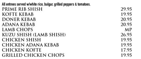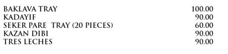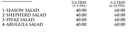 HUMUS 25.00 40.00 50.00 70.00 120.00 ANTEP EZME 25.00 40.00 50.00 70.00 120.00 BABAGANUJ 25.00 40.00 50.00 70.00 120.00 EGPLANT SALAD 25.00 40.00 50.00 70.00 120.00 HAYDARI 25.00 40.00 50.00 70.00 120.00 EGGPLANT SOSLU 30.00 45.00 55.00 80.00 135.00 STUFFED GRAPE LEAVES $1.35 PIECE